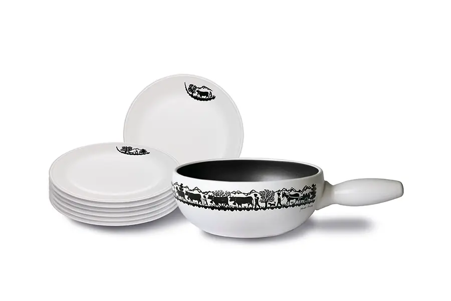 Für ein stilechtes Käsefondue haben wir beispielsweise das Set Tradition Alpaufzug im Sortiment. Es besteht aus einem Caquelon und sechs Fonduetellern, die in Schwarz gehalten und mit Alpaufzug-Motiven verziert sind. Das Caquelon ist induktionsfähig und somit flexibel nutzbar. Wir führen das Set auch in Weiss.