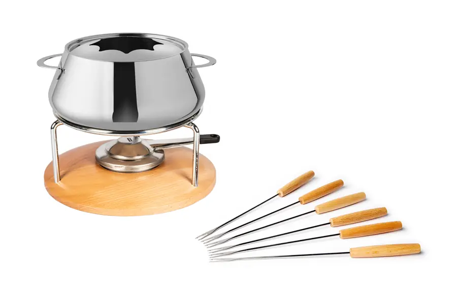 Fonduegarnitur Säntis: Dieses Set besteht aus einem geschliffenen Edelstahltopf mit Spritzschutz und einem Rechaudsockel aus Buchenholz mit Pasten-Sicherheitsbrenner. Es ist induktionsfähig und eignet sich hervorragend für Fleisch- und Fischfondues.