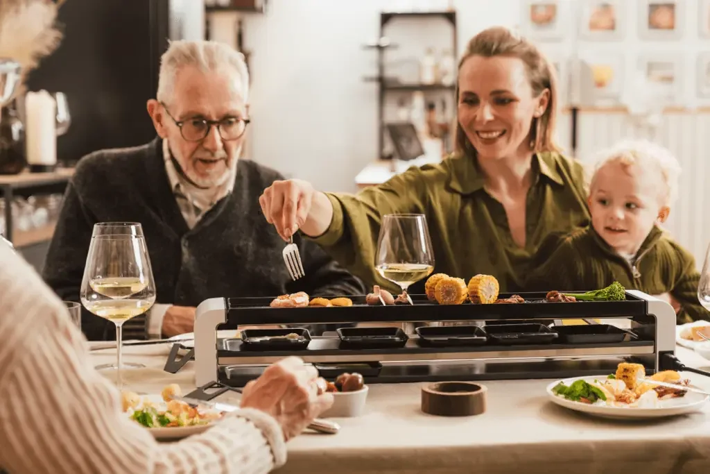 - Geselligkeit: Beim Raclette wird gemeinsam am Tisch gekocht. Auch als Gastgeber sind Sie Teil der Runde und nehmen an den Unterhaltungen teil. Das Kochen am Tisch ist eine grossartige Gelegenheit, um Zeit mit Familie, Freunden und Kollegen zu verbringen.